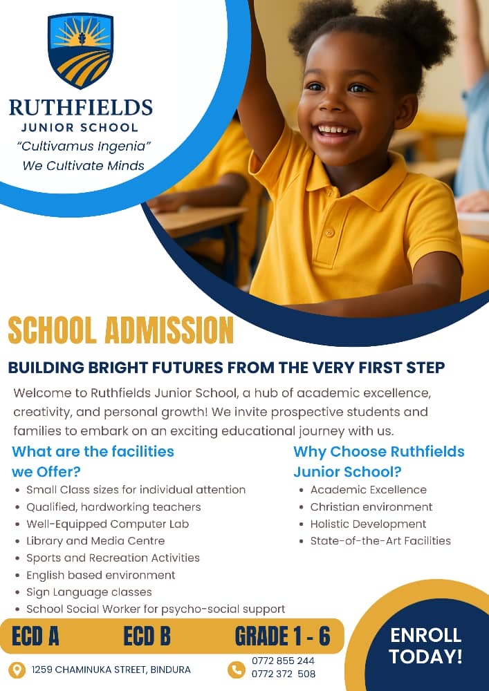 We Invite you to the new Junior School in Bindura in Chaminuka Street Ruthfields Junior School , More information is on the poster.